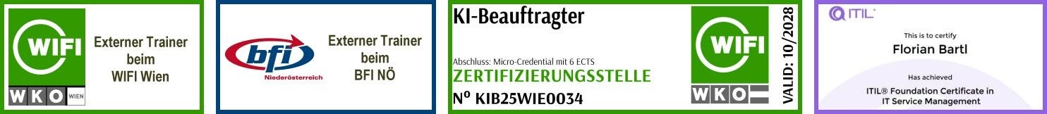 - Externer Trainer für Künstliche Intelligenz am WIFI Wien und am BFI Niederösterreich